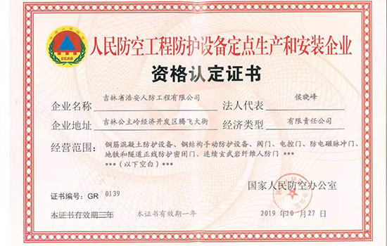 吉林省浩安人防工程有限公司是經(jīng)國家人民防空辦公室批準(zhǔn)成立的人防工程防護(hù)設(shè)備定點(diǎn)生產(chǎn)廠,2019年認(rèn)定為國家級高新技術(shù)企業(yè)。本廠擁有現(xiàn)代化的廠房及先進(jìn)的生產(chǎn)設(shè)備,集生產(chǎn)制造、質(zhì)量控制、銷售服務(wù)為一體的區(qū)域性行業(yè)廠。公司座落在吉林省公主嶺經(jīng)濟(jì)開發(fā)區(qū),占地面積達(dá)10000平方米,辦公樓1200平方米,廠房建筑面積達(dá)6000平方米以上,注冊資金1000萬元,企業(yè)的技術(shù)力量雄厚,其中防護(hù)工程師,高級工程師及中高級專業(yè)技術(shù)人員占30%。青海分公司2018年10月15日成立,于當(dāng)年11月26日通過 青海人民防空辦公室備案公示。 本廠經(jīng)營的主要產(chǎn)品:連續(xù)玄武巖纖維新型人防防護(hù)門、鋼結(jié)構(gòu)人防防護(hù)門、鋼筋混凝土人防防護(hù)門以及各種型號的通風(fēng)設(shè)備和防化設(shè)備。本廠生產(chǎn)設(shè)備齊全,擁有雄厚的生產(chǎn)能力和技術(shù)水平,并嚴(yán)格按照國家相關(guān)標(biāo)準(zhǔn)生產(chǎn)和安裝。2015年5月15日正式開業(yè)至今,承接吉林省人防工程項目上百項,總施工面積超過百萬平方米。工程項目包含人防指揮所、醫(yī)院、地下商場、商場、學(xué)